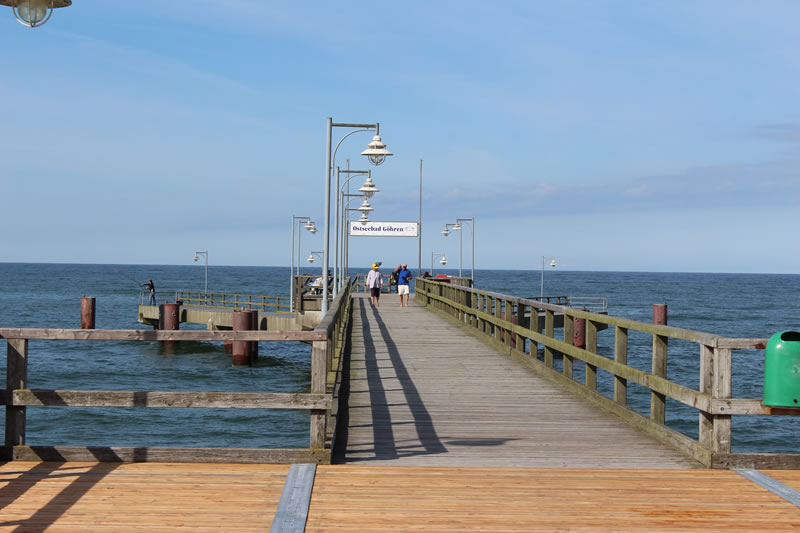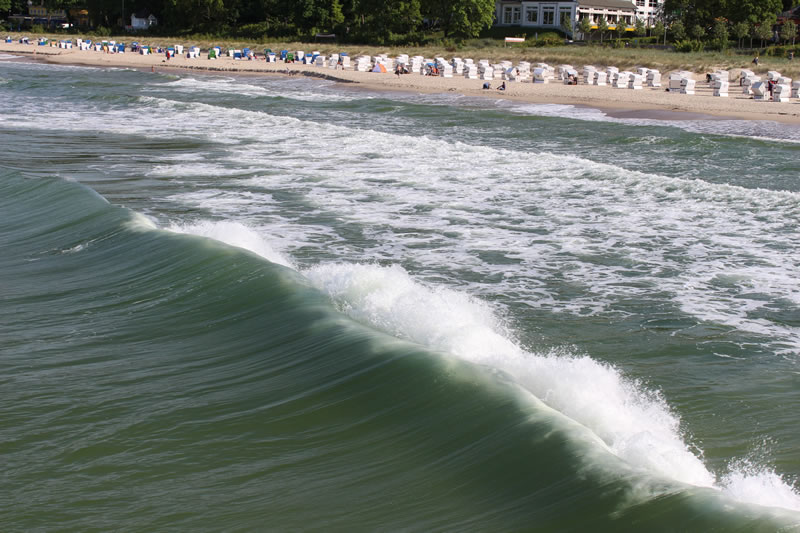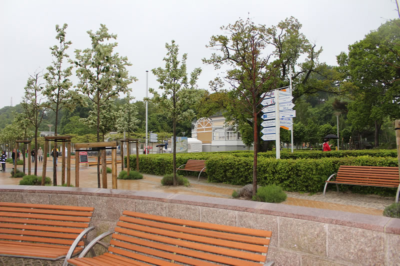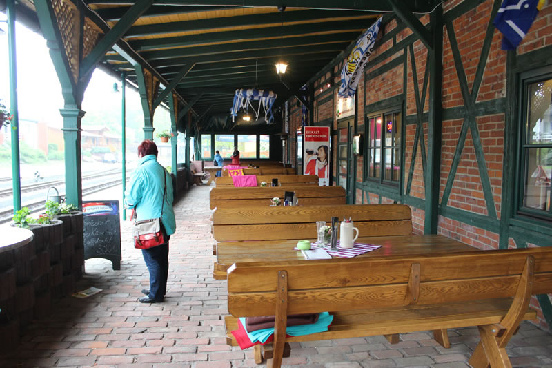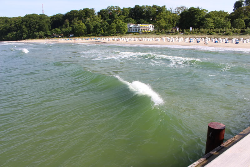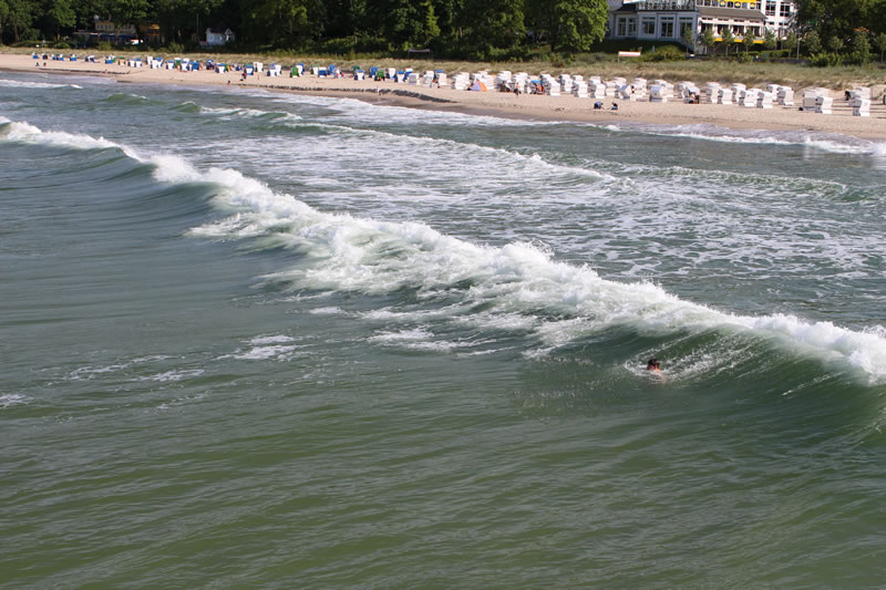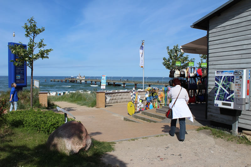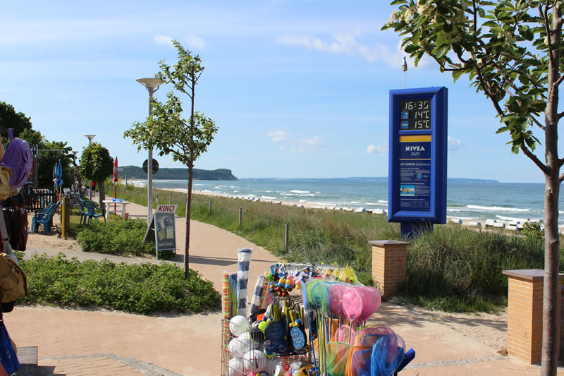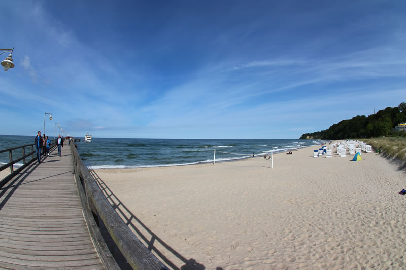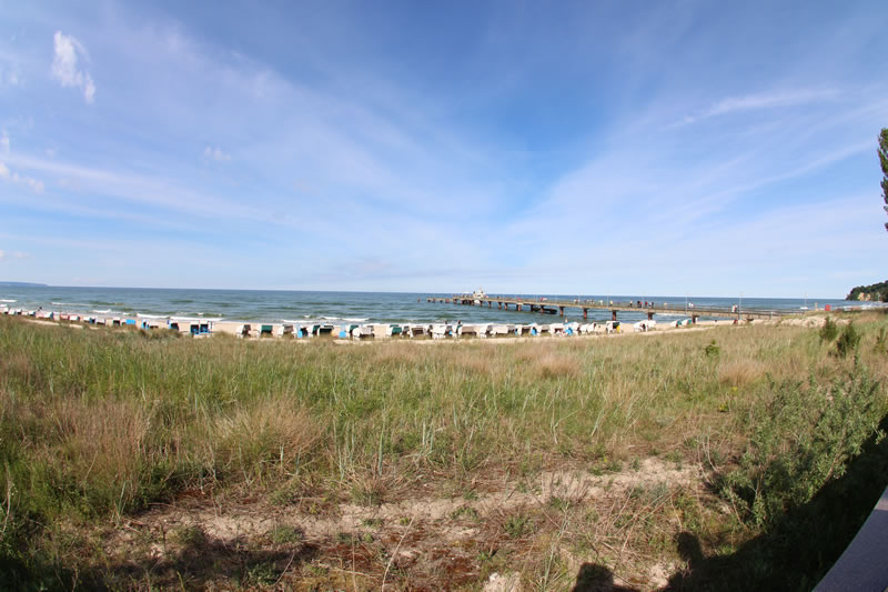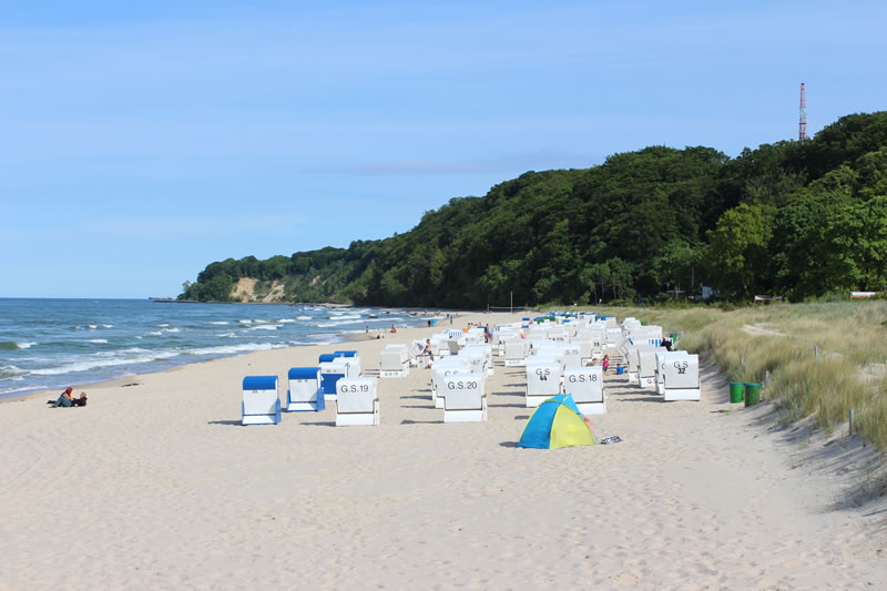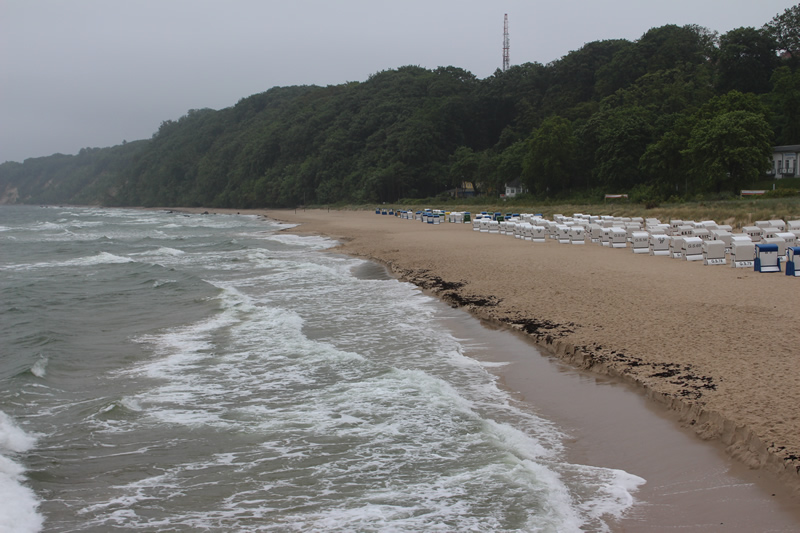 Letzte Haltestelle der Rügenschen Bäder Bahn in dieser Richtung. Der rasende Roland hällt praktisch fast am Strand. Der Ort selbst liegt steil oberhalb von Strand und Bahnhof.