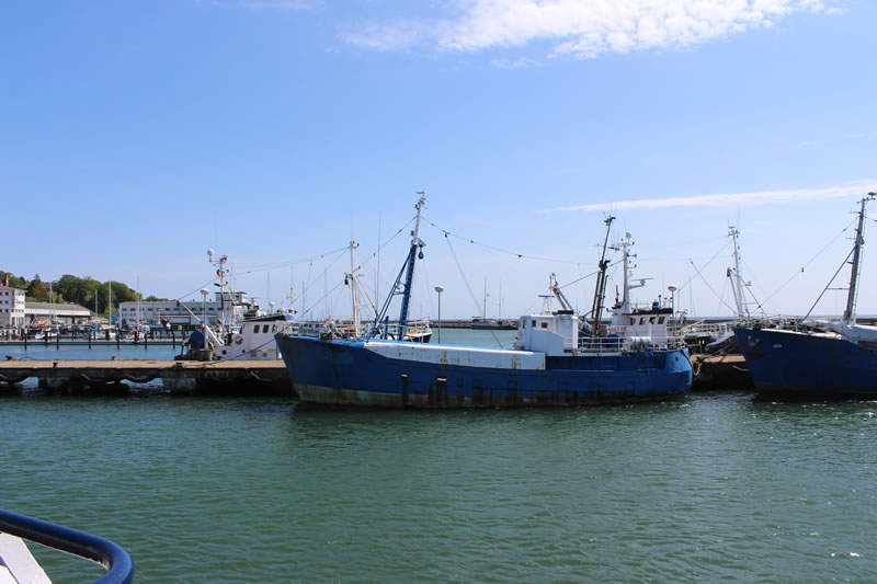 mit Fähre. Stadthafen Sassnitz dort steht noch das alte Fährgebäude. Im Hafen